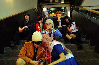 Hahmot ja cossaajat oikealta ylhäältä: Keigo Kurusu (Fainttos) Tsubaki (Brouk) sitten vaaleansinisessä takissa Akise Aru (Prodigy) Marco Ikusaba (tämän hetkinen kirjoittaja tutti), Ai Mikami (Rita) Ja alas puhelimella dataavat poika Yukiteru Amateru (Rollingay/Tuure) Yuno Gasai (Sofia) Ja sarjahan on Mirai Nikki |